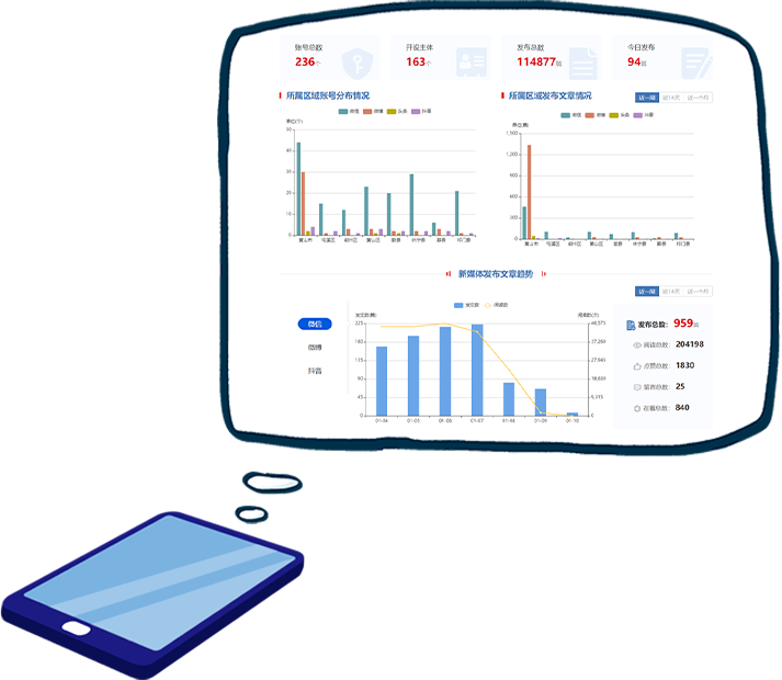 運(yùn)用大數(shù)據(jù)分析技術(shù),對(duì)黃山市236個(gè)政務(wù)新媒體賬號(hào)發(fā)布的多維、海量、動(dòng)態(tài)數(shù)據(jù)進(jìn)行采集、加工處理、分析挖掘,建立新媒體指數(shù)模型,以多維圖表方式進(jìn)行可視化分析展現(xiàn)。