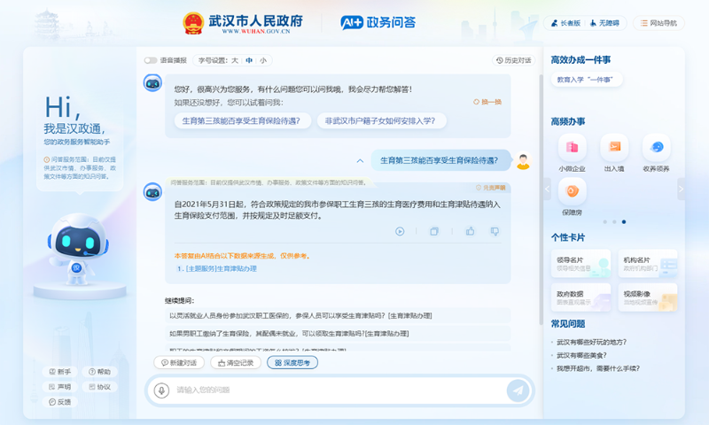 為響應(yīng)國務(wù)院關(guān)于“高效辦成一件事”的總體工作部署,深入推動政務(wù)服務(wù)提質(zhì)增效,武漢市政府搶抓認(rèn)知智能大模型發(fā)展趨勢,攜手龍訊科技,結(jié)合目前武漢市人民政府網(wǎng)站智能問答現(xiàn)狀,通過引入人工智能技術(shù),打造一個有問必應(yīng)、服務(wù)周到的智能問答服務(wù)平臺,用窗口化的服務(wù)架起又一座與群眾溝通的“連心橋”,實現(xiàn)讓數(shù)據(jù)多跑路,讓群眾少跑腿,讓民政服務(wù)變得更有溫度。從而提高政務(wù)咨詢的效率和質(zhì)量,優(yōu)化用戶體驗,提升政務(wù)信息公開和透明度,加強政府與公眾的互動和溝通,推動政務(wù)數(shù)字化轉(zhuǎn)型,為公眾提供更加便捷、高效、智能的政務(wù)服務(wù)。